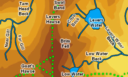 Brim Fell can claim part of Low Water, which it shares with the Old Man and part of Levers Water, shared with Swirl How and Black Sails. In the west Goat's Water and Seathwaite Tarn both just all outside the fell.