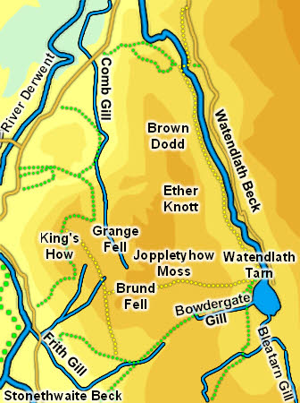 The northern boundary, along the finger of high ground heading towards Lodore, is rather ill-defined - if we take Ether Knott as a boundary then the northern boundary is formed by a nameless beck to the east and Comb Gill coming out of Bleacrag Moss to the west - if we take the entire ridge as one entity then the northern boundary is Derwent Water.