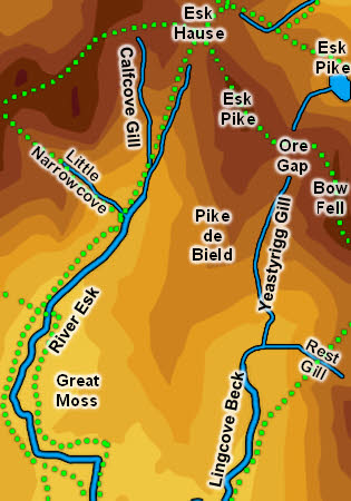 To the west the boundary is formed by the upper reaches of the River Esk itself, which is born near the true Esk Hause and flows south from there. Esk Pike can lay claim to the long finger of land that runs south to the junction between Lingcove Beck and the Esk. Lingcove Beck forms the south-east border of the fell, while the eastern border, with Bow Fell, is formed by Yeastyrigg Gill, which flows south to join Lingcove Beck.