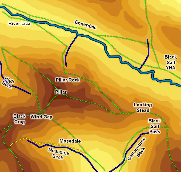 There are three main paths onto the summit plateau of Pillar - east from Black Sail Pass, south-west from Wind Gap and north-west over White Pike from Ennerdale. The eastern path can really only be reached from the top of Black Sail Pass, and the north-western ridge via forest paths in Ennerdale.