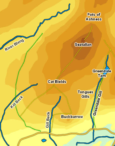 The large area of Seatallan is bordered to the north and west by the River Bleng. In the south the ground levels out close to the road into Wasdale Head, with the River Irt acting as a southern boundary.