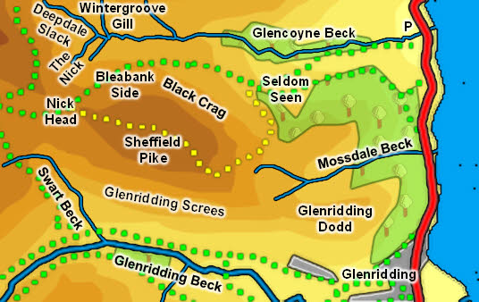 Two ridges run east from Sheffield Pike towards Ullswater. The northern of these is clearly part of Sheffield Pike, but the southern ridge rises up to form Glenridding Dodd. The beck between these two ridges, Mossdale Beck, thus forms an east-flowing boundary of the fell, while the nameless beck that flows south from The Rake into Glenridding forms the south-eastern boundary.