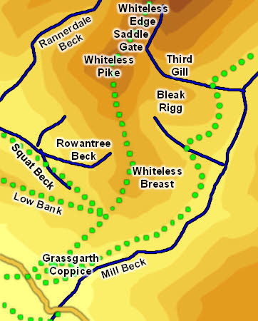 Quite a few small becks rise on Whiteless Pike, but only Rowantree Beck, which rises between Whiteless Breast and the main summit and flows west into Squat Beck, gets a name.