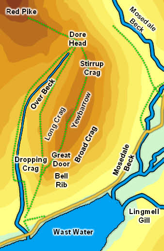 The most dramatic crags are at the northern end of the fell, where they drop 1,000 ft in the same horizontal distance down into Mosedale. Just to the north-west of these crags is Dorehead Screes, once a famous scree run but now eroded away and a rather nasty route.