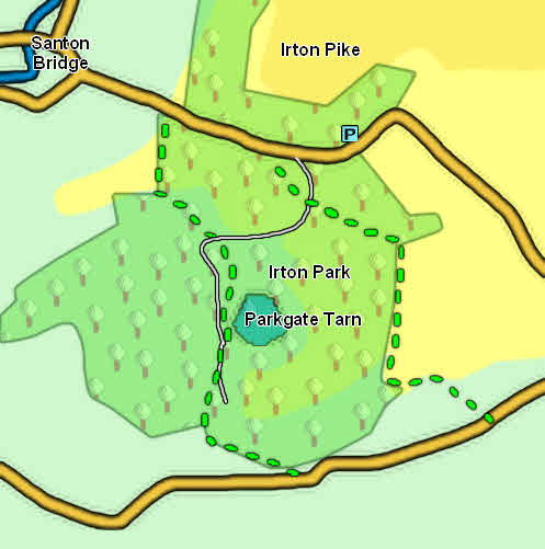 Sadly Partgate Tarn sits in one of the few areas of Forestry Commission land that isn't access land (and the tarn isn't actually managed by the Commission). However a public right of way does pass very close to the western tip of the tarn, so it can at least be visited. This path links the roads north and south of Irton Park. The easiest access comes from the north - park in the disused quarry almost due south of the top of Irton Pike. Head west along the road to the western end of the woods, then turn left onto a track that runs south past the woods. This then turns left into the woods, before turning back right to run south. The western tip of the tarn will eventually be glimpsed from this path.