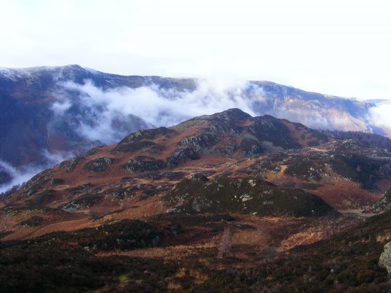 The view towards King's How from the top of Brund Fell, looking across Grange Fell, with Maiden Moor in the background.
