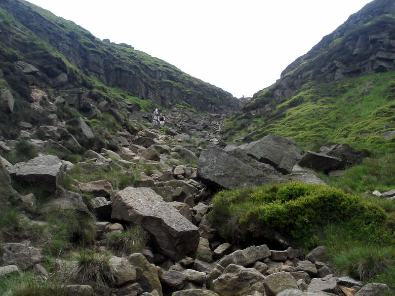 Looking up Grindsbrook Clough from close to the top. On this day the clough was dry until other streams joined from the sides, but even then the path remains clear and dry all the way down. The route down the clough requires a bit of care but is actually much safer and easier than it looks from a distance.